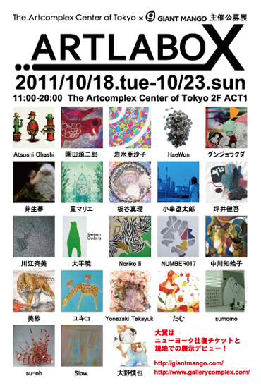 「ARTLABO X」は、ACTで2008年から開催されている公募企画「Artcompe X」と、giant mangoの公募企画を合体させ、共同で主催する公募展企画です。ACT2階ギャラリースペースの1つ「ACT1」で、年間を通して5回(偶数月)の展示会を1次審査として開催します。
