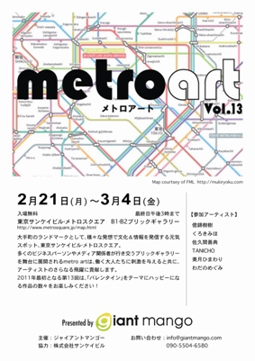 そんなメトロスクエアの地下1・2階に設けられた「ブリックギャラリー」は、レンガの壁面が感じさせる土の温もりの中、自由に作品をご覧いただけるパブリックスペースです。多くのビジネスパーソンやメディア関係者が行き交うブリックギャラリーを舞台に展開される『metro art (メトロアート)』は、働く大人たちに刺激や癒しを提供すると共に、アーティストのさらなる飛躍に貢献します。